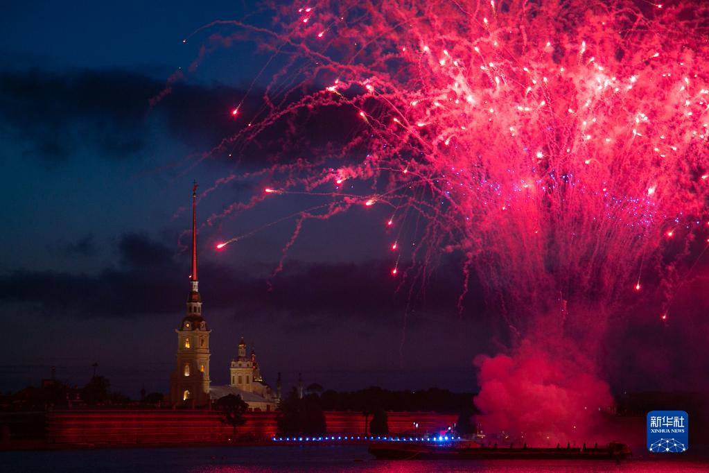 6月24日晚至次日凌晨,俄罗斯圣彼得堡迎来一年一度的“红帆节”。节日期间,冬宫广场上演大型音乐会,一艘“红帆”在漫天烟花的映衬下驶过涅瓦河,庆祝中学生毕业、走向人生新起点。