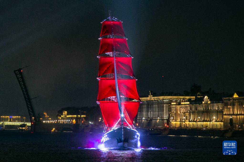 6月24日晚至次日凌晨,俄罗斯圣彼得堡迎来一年一度的“红帆节”。节日期间,冬宫广场上演大型音乐会,一艘“红帆”在漫天烟花的映衬下驶过涅瓦河,庆祝中学生毕业、走向人生新起点。
