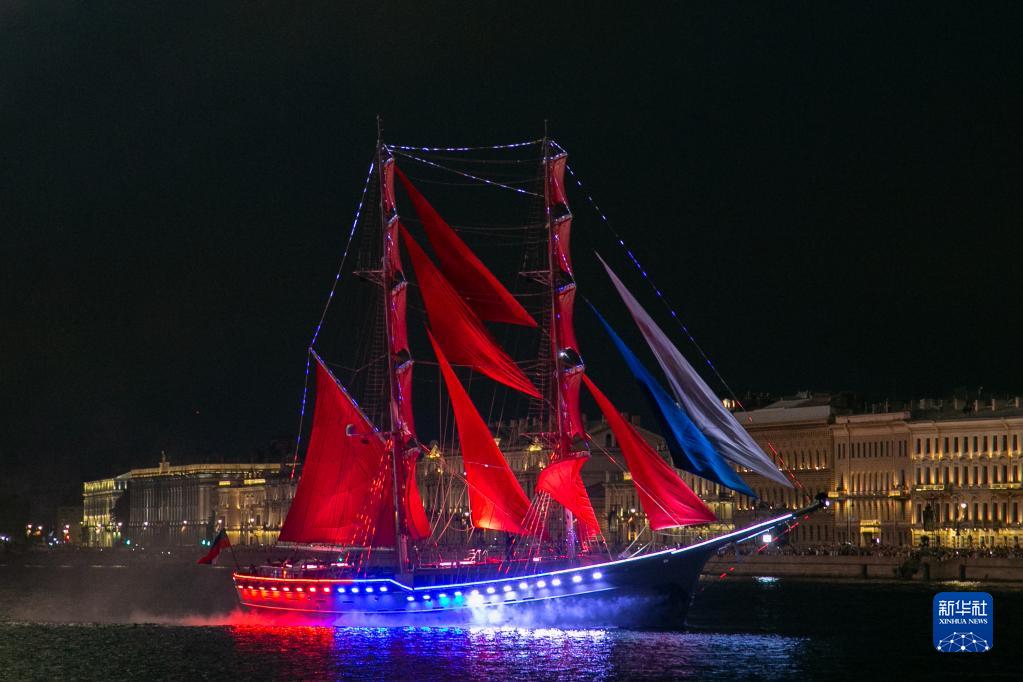 6月24日晚至次日凌晨,俄罗斯圣彼得堡迎来一年一度的“红帆节”。节日期间,冬宫广场上演大型音乐会,一艘“红帆”在漫天烟花的映衬下驶过涅瓦河,庆祝中学生毕业、走向人生新起点。