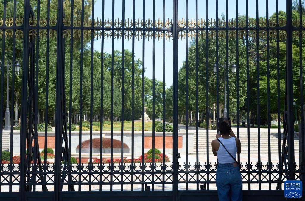 6月25日,一名女子在西班牙马德里因高温红色警报关闭的丽池公园外拍摄。
