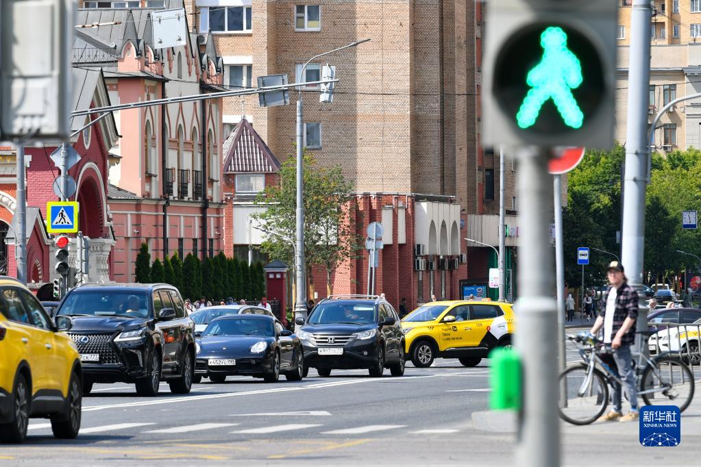 6月26日,在俄罗斯首都莫斯科,车辆驶过市内道路。