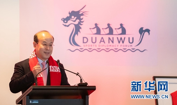 图为中国驻澳大利亚大使肖千在体育外交午宴上致辞。胡泾辰 摄