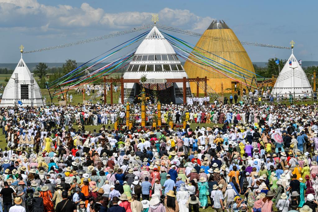6月24日,在俄罗斯雅库茨克,雅库特人跳集体舞庆祝“恩萨赫”节。