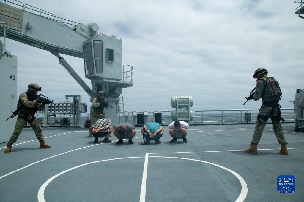 6月26日,中国海军第43批护航编队与科特迪瓦海军在科近海进行联合演练。这是特战队员控制“海盗”。新华社发(吴亢慈摄)