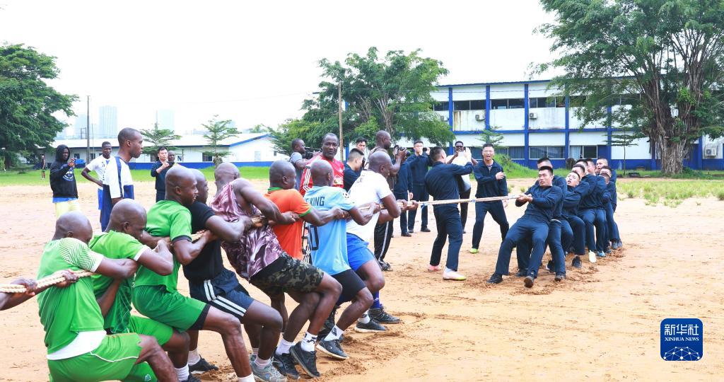 6月24日,中国海军第43批护航编队官兵与科特迪瓦海军官兵在科海军基地进行拔河友谊赛。新华社发(吴亢慈摄)