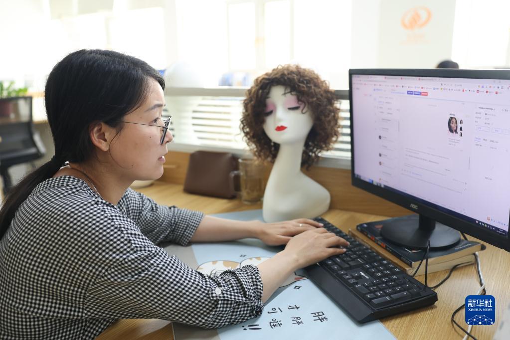 5月25日,工作人员在湖南邵阳阳光发品有限公司办公室内通过电商平台向海外销售假发。