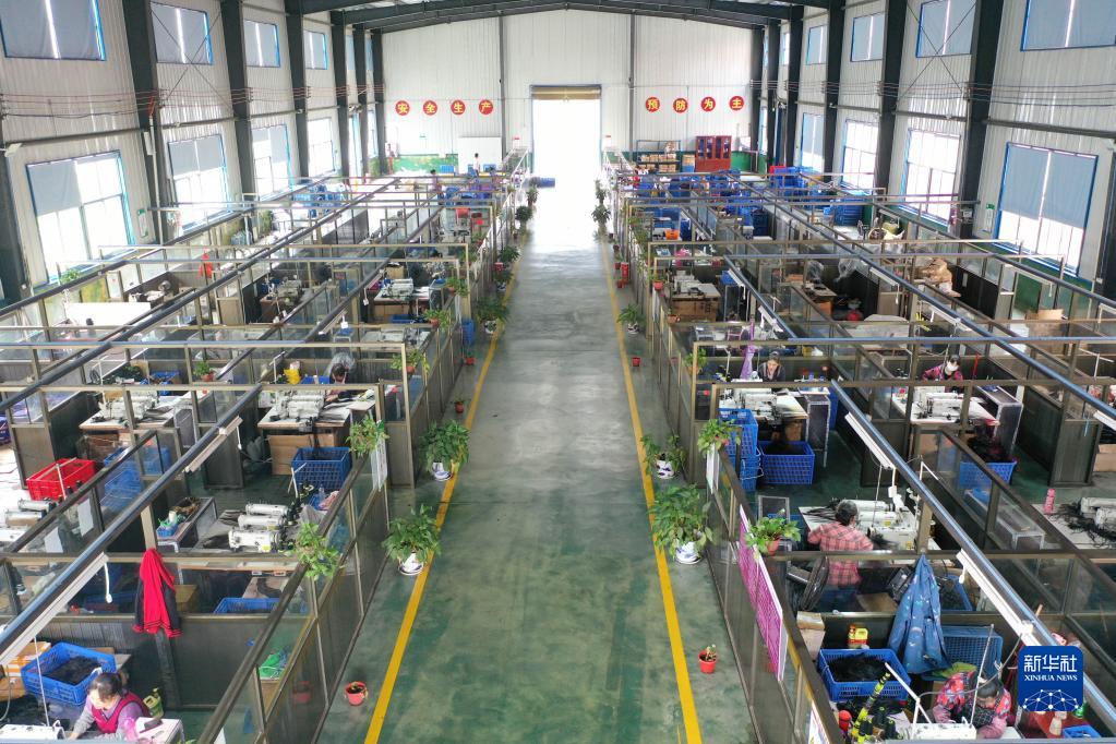 5月25日,工人在湖南邵阳美丽来发制品有限公司车间内生产假发(无人机照片)。