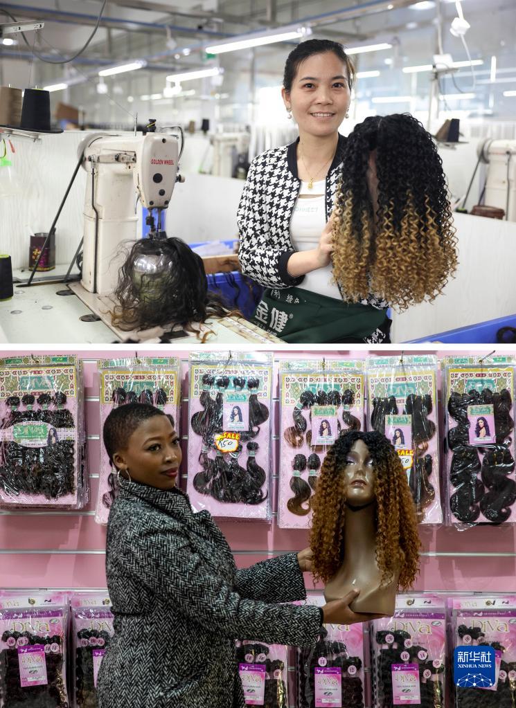 拼版照片:上图为5月25日,工人在湖南邵阳美丽来发制品有限公司车间内展示假发(新华社记者薛宇舸摄);下图为6月9日,一名店员在湖南邵阳美丽来发制品有限公司位于南非约翰内斯堡的的店铺内展示假发(新华社记者张誉东摄)。