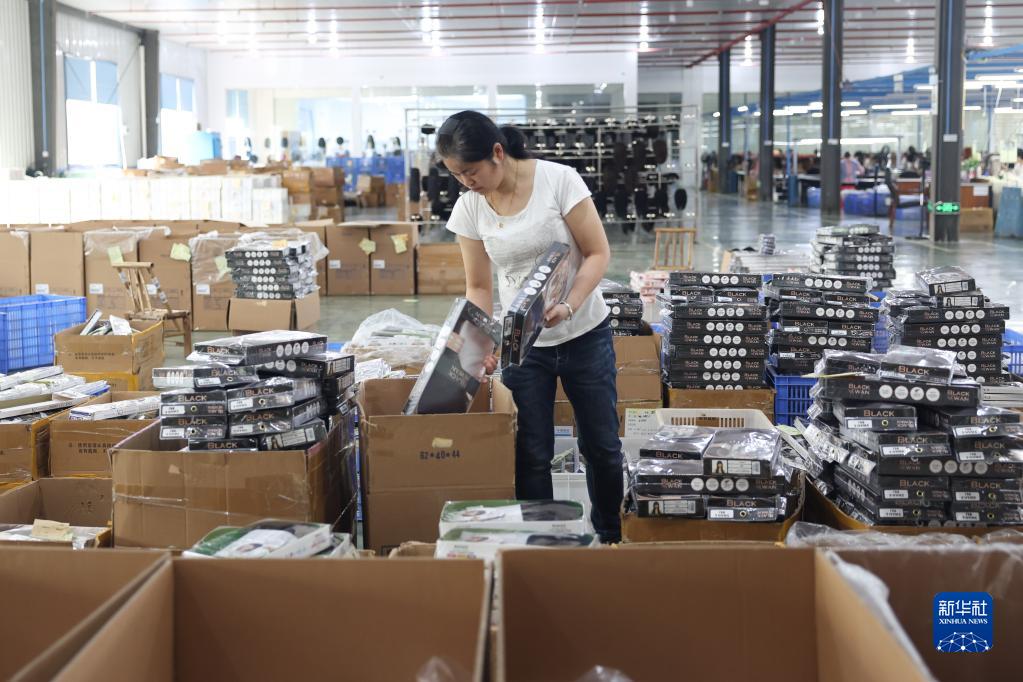 5月25日,工人在湖南邵阳阳光发品有限公司车间打包假发产品。