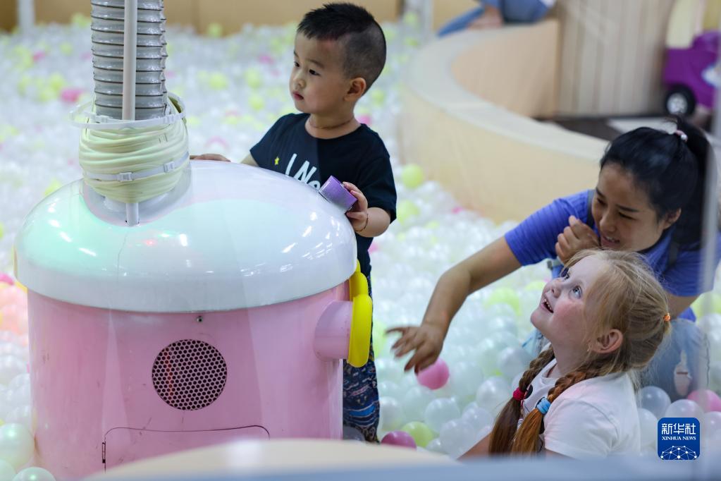 6月27日,小朋友在珲春市一家商场内的儿童乐园玩耍。