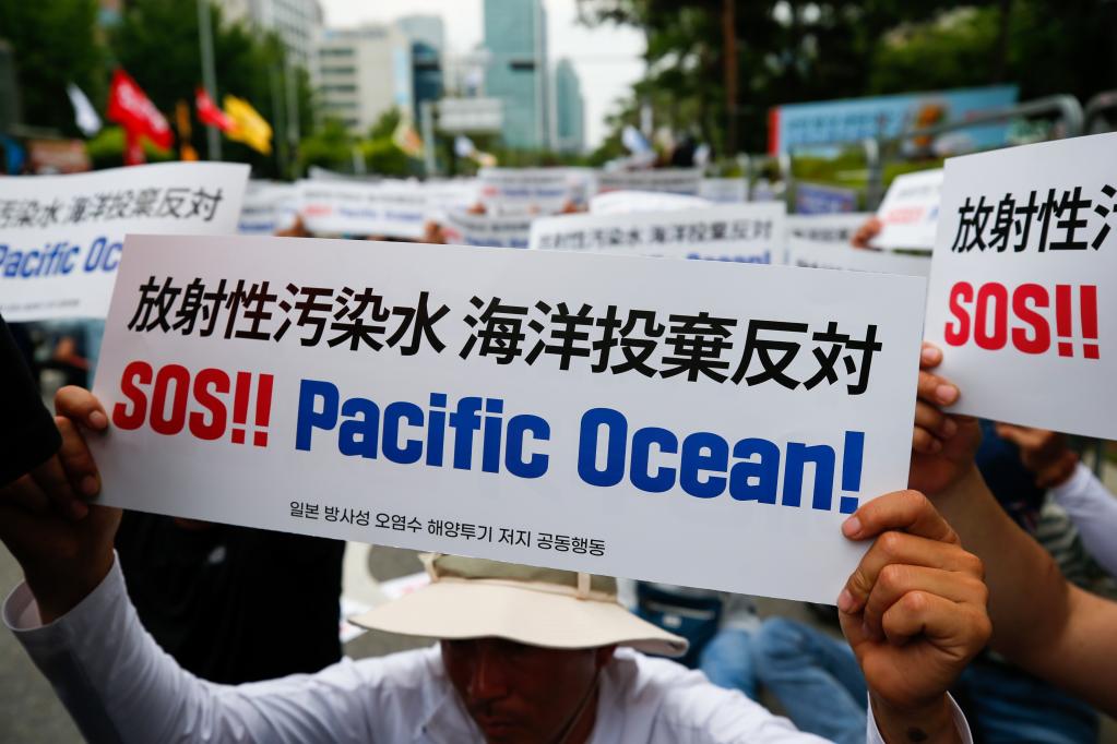 2023年6月12日,民众在韩国首尔手举标语牌参加集会,反对日本核污染水排海。新华社记者 王益亮 摄