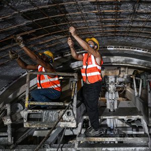 6月28日,在位于马来西亚彭亨州的马东铁项目云顶隧道施工现场,工人在敞开式硬岩隧道掘进机护盾尾端作业。