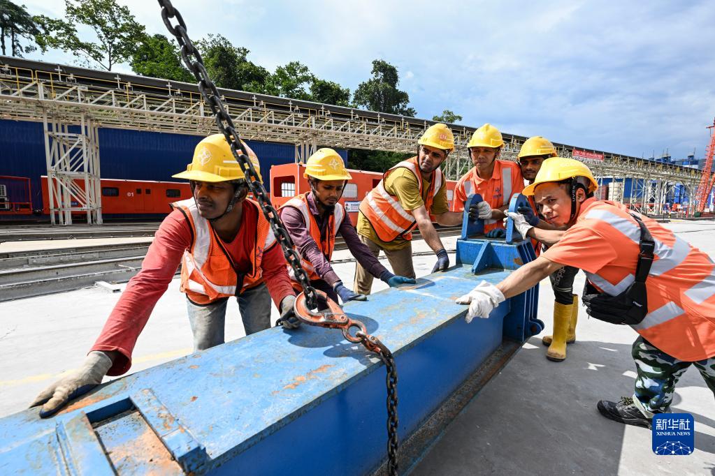 6月28日,在位于马来西亚彭亨州的马东铁项目云顶隧道施工现场附近,几名工人合力作业。
