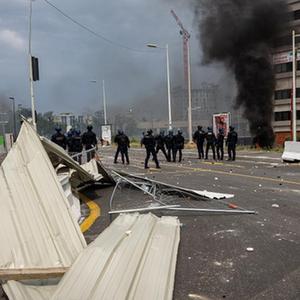 6月29日,在法国上塞纳省楠泰尔市,警察在骚乱现场警戒。