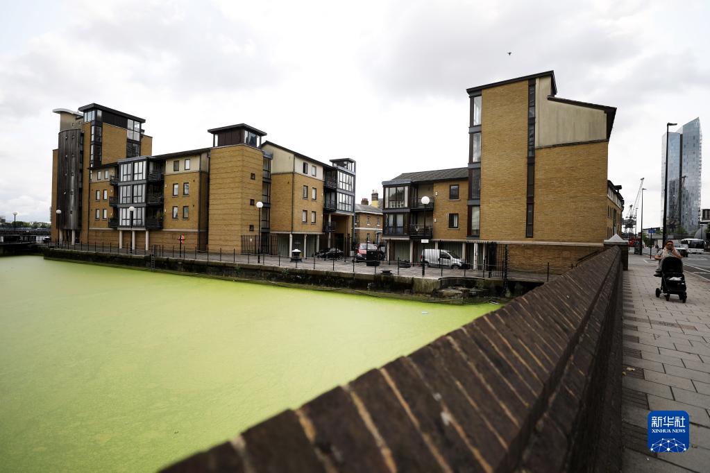 由于当地气温升高等原因,英国伦敦泰晤士河畔码头的一处水域被浮萍覆盖。