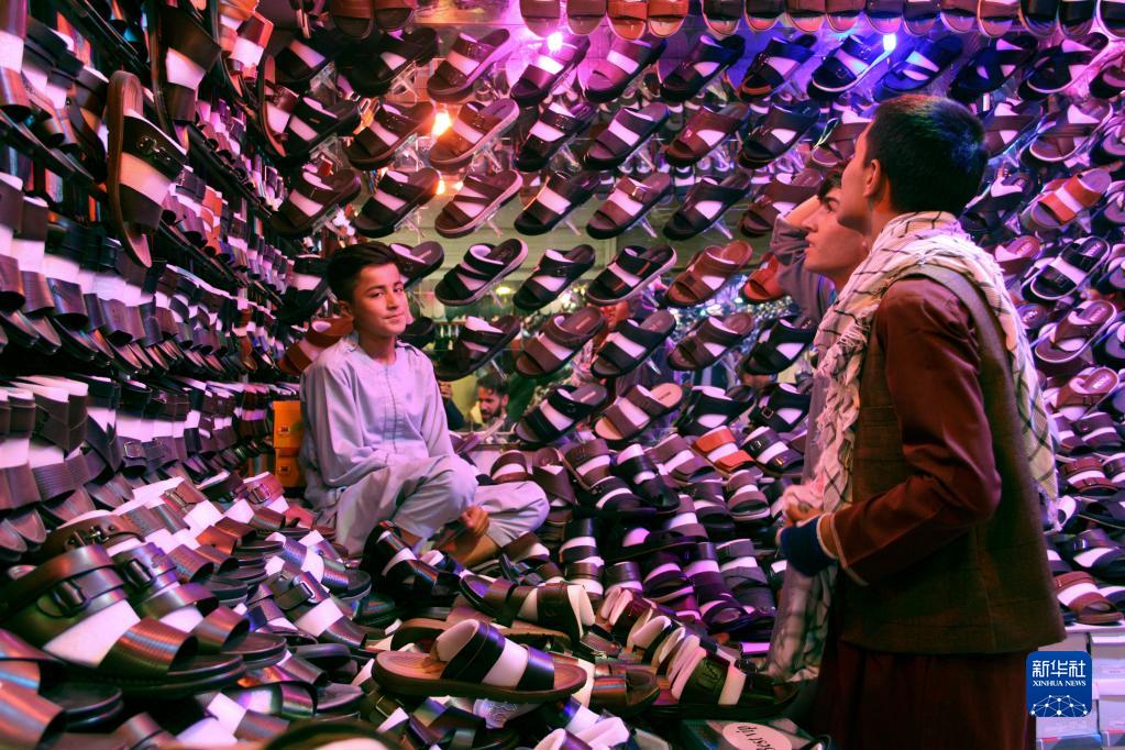 6月26日,一名少年在阿富汗加兹尼省一处市场卖鞋。