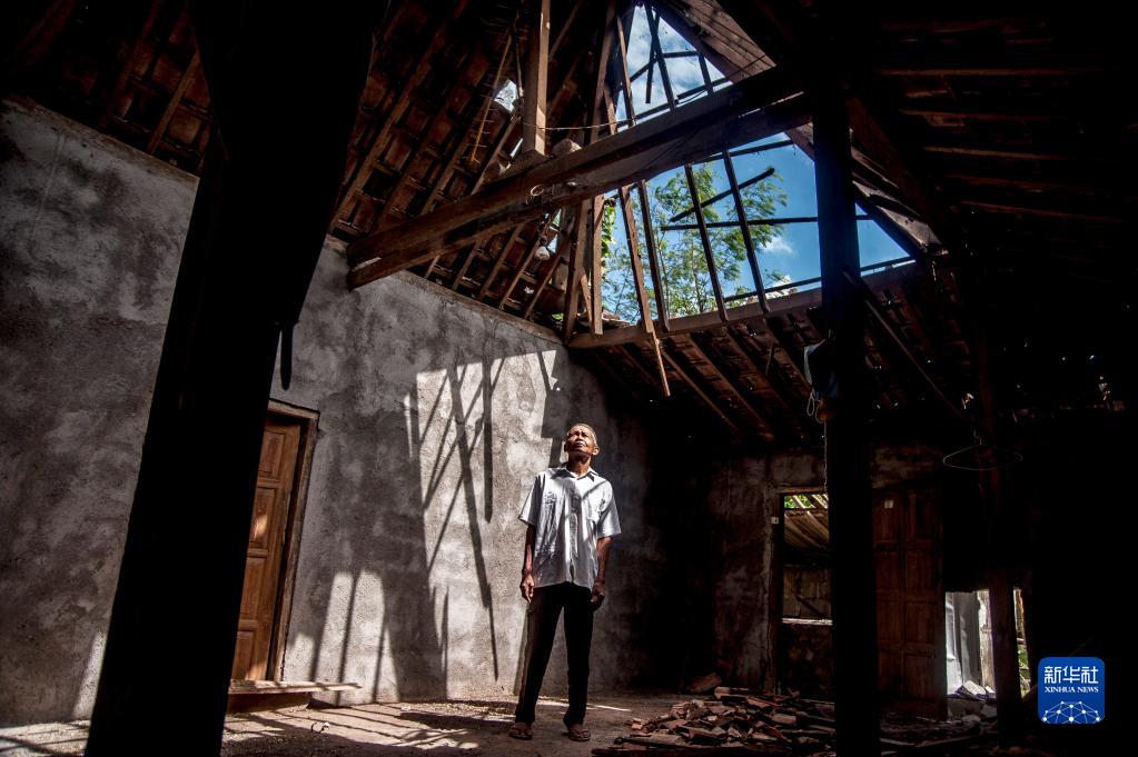 7月1日,在印度尼西亚日惹特区帕卡雷霍村,一名男子站在被地震破坏的房屋内。