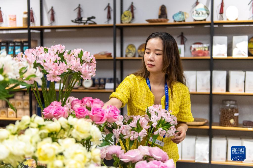 7月1日,在湖南高桥大市场,博览会常设展馆展区肯尼亚馆馆长黄梓楠在整理产自非洲的鲜花。新华社记者 陈思汗 摄
