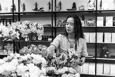 7月1日,中非经贸博览会常设展馆展区肯尼亚馆馆长黄梓楠在整理产自非洲的鲜花。 新华社记者 陈思汗 摄