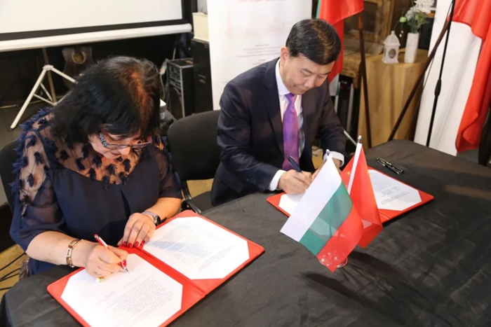 中国记协书记处书记田玉红(右)与保加利亚记联主席托多罗娃在索非亚签署“中保记者之家”共建备忘录。