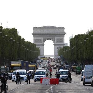 7月2日晚间,警察在法国巴黎香榭丽舍大道上封路巡逻。新华社记者高静摄