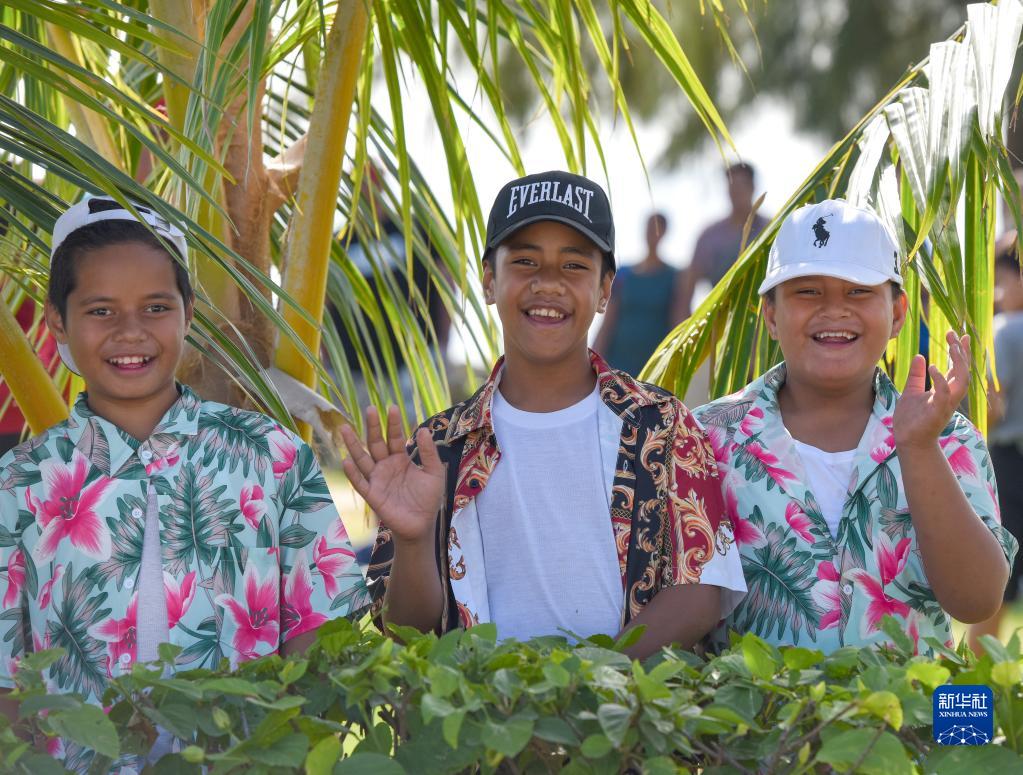 这是7月4日在汤加首都努库阿洛法拍摄的观看花车游行活动的儿童。