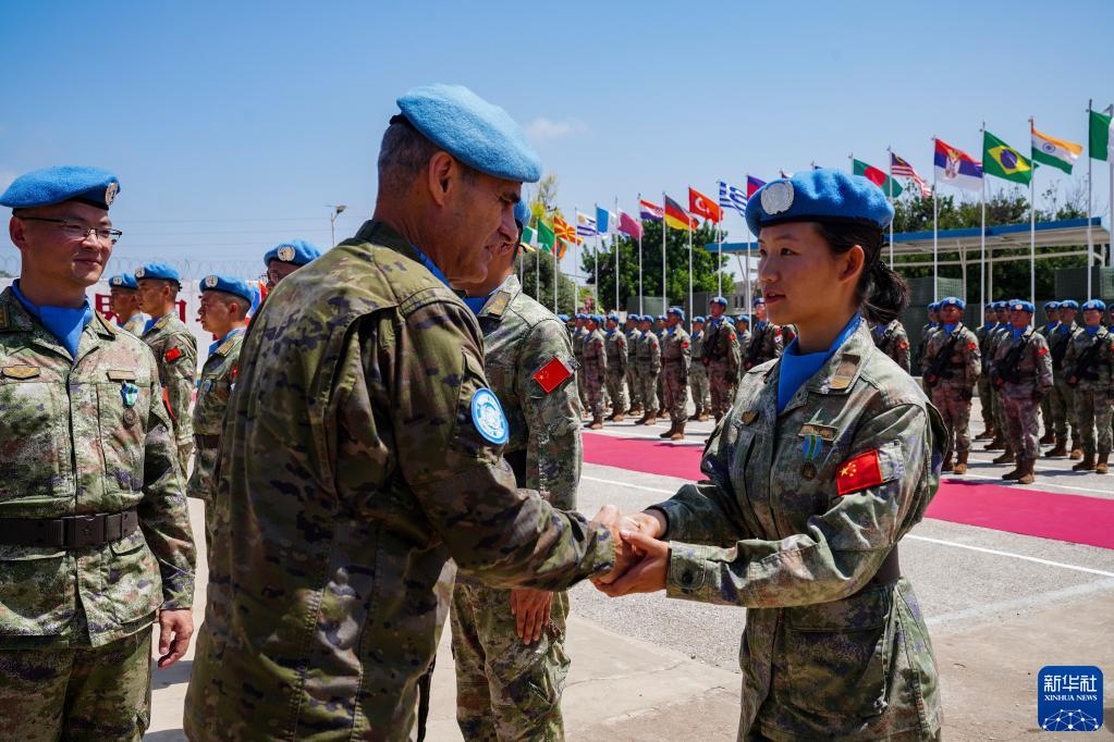 7月4日,在黎巴嫩南部地区辛尼亚村中国维和营,联合国驻黎巴嫩临时部队官员为中国维和官兵佩戴“和平荣誉勋章”。新华社发(李竹林摄)