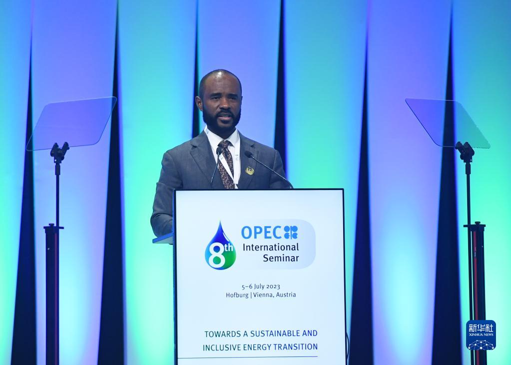 7月5日,在奥地利维也纳,欧佩克轮值主席、赤道几内亚矿产与石化部长安东尼奥·奥布罗·翁多在第八届欧佩克国际研讨会上致辞。