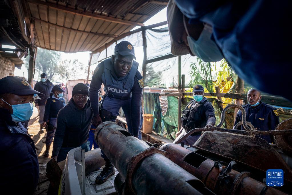 7月6日,警察在南非豪滕省埃库尔胡莱尼市的事发现场转移气罐。