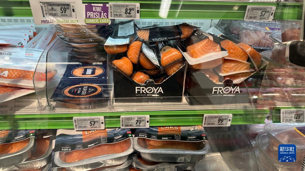 这是7月5日在挪威首都奥斯陆一家超市拍摄的三文鱼等海产品。