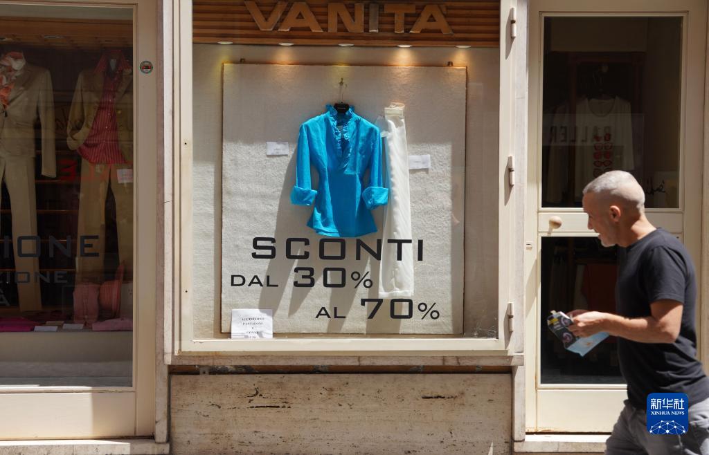 7月6日,一名男子经过意大利罗马一处店铺的夏季打折广告牌。