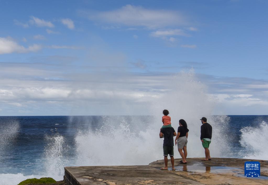 7月6日,人们在汤加首都努库阿洛法的海岸边观看海浪。