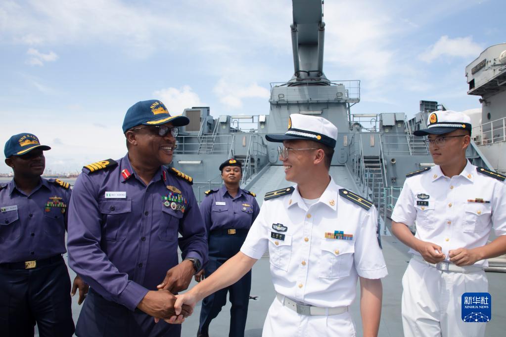 7月4日,在尼日利亚拉各斯,中国编队官兵代表参观尼日利亚海军舰艇。新华社发(刘哲浩 摄)