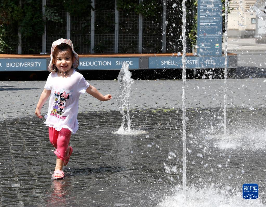 7月8日,一名女孩在德国法兰克福的一处喷泉玩水。