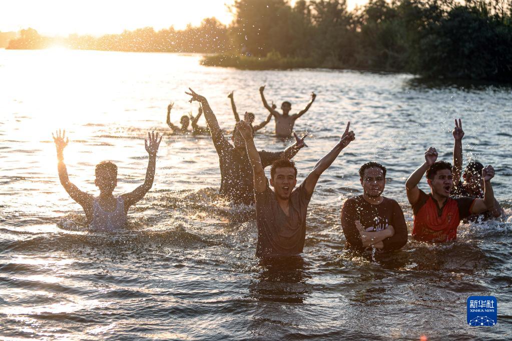 7月8日,在埃及盖卢比尤省,人们在尼罗河里戏水避暑。