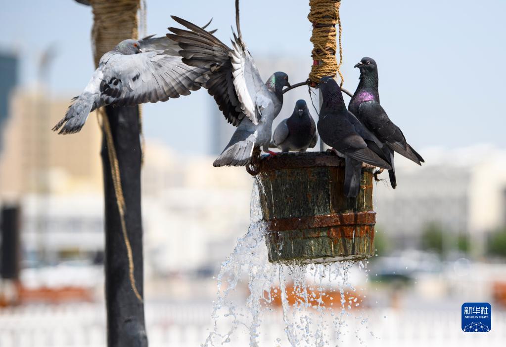 7月6日,在卡塔尔多哈,鸟群在戏水纳凉。
