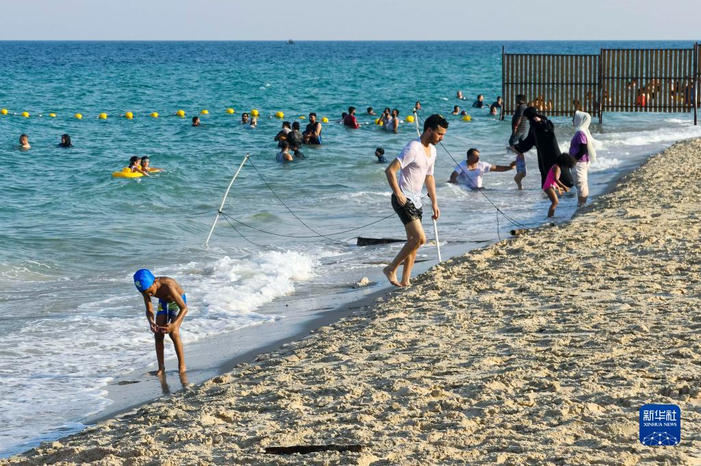 7月7日,在卡塔尔多哈,人们在海边消暑。