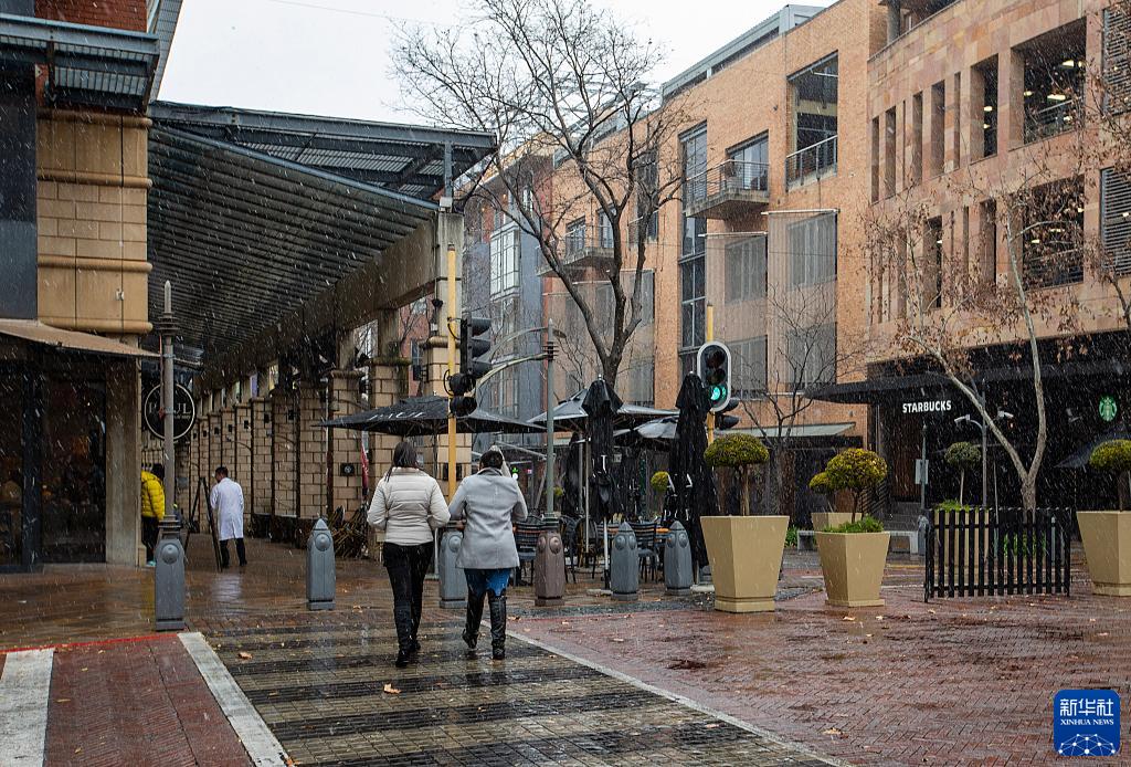 7月10日,在南非约翰内斯堡一处商业区,人们在雪中行走。