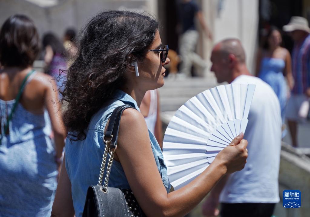 7月10日,一名女子在意大利罗马街头扇扇子降温。