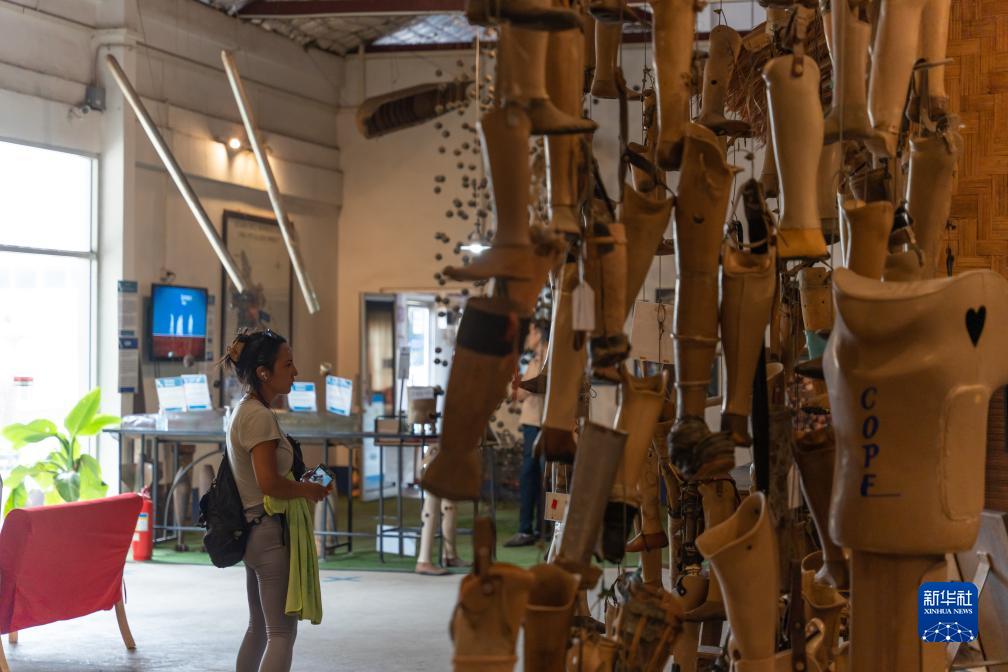 7月11日,一名女子在老挝首都万象“义肢与矫形合作事业”展馆参观老挝未爆弹受害者康复服务展。