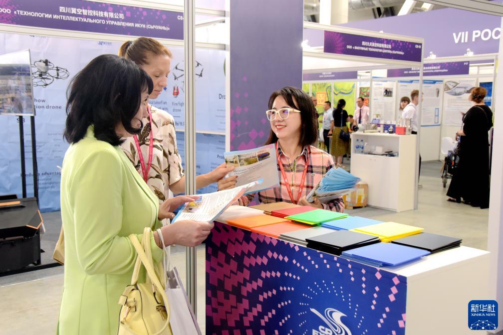 7月11日,在俄罗斯叶卡捷琳堡举办的第七届中俄博览会上,参观者与中方参展代表交谈。