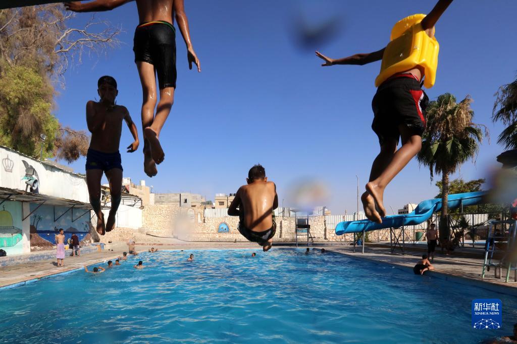 7月12日,在约旦扎尔卡,人们跃入泳池。