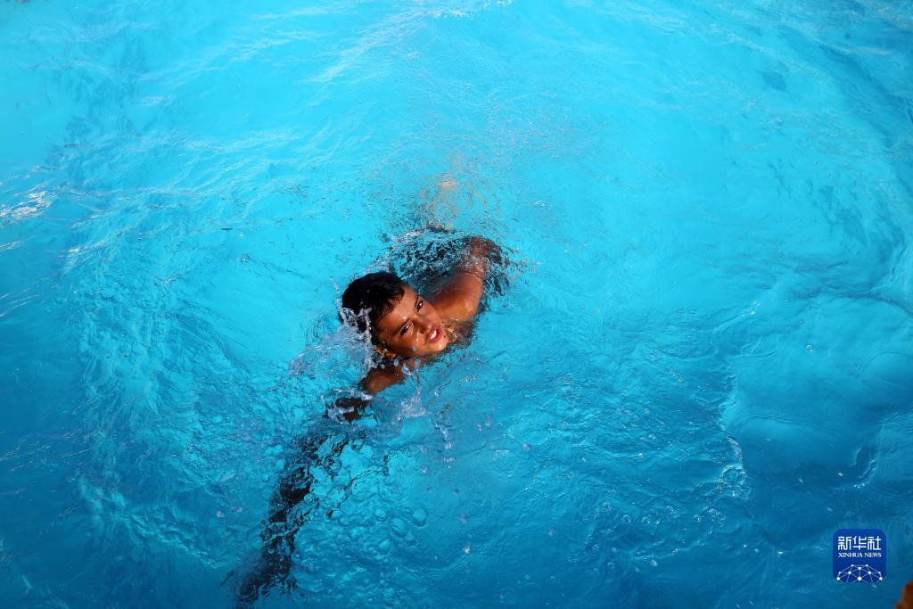 7月12日,在约旦扎尔卡,一名男孩在泳池中游泳。