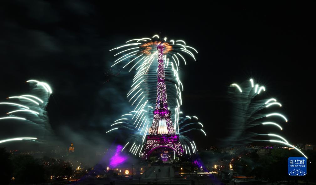 7月14日,焰火在法国巴黎埃菲尔铁塔周围绽放。