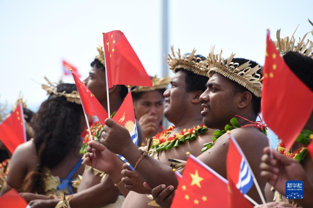 7月15日,中国海军“和平方舟”号医院船抵达基里巴斯塔拉瓦,当地民众手持两国国旗欢迎“和平方舟”号来访。新华社记者 黎云 摄