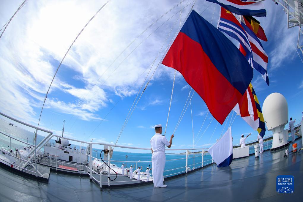 7月15日,中国海军“和平方舟”号医院船悬挂满旗抵达基里巴斯塔拉瓦。新华社发(黎宇 摄)