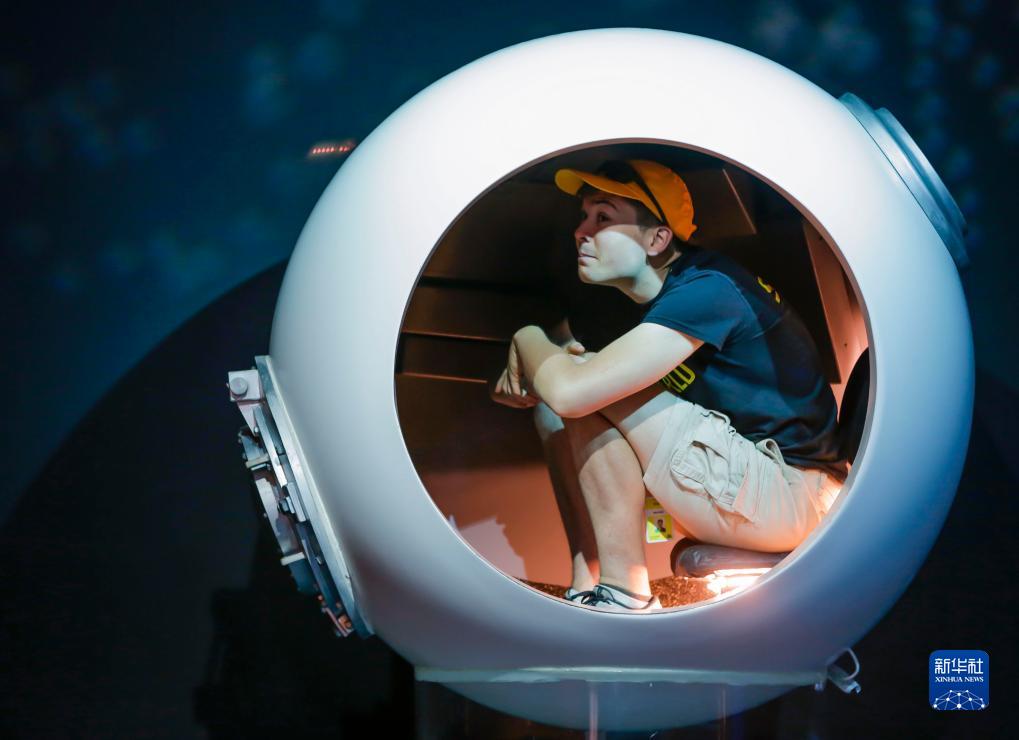 7月10日,在加拿大温哥华举办的“挑战深海”专题展上,参观者体验“深海挑战者”号载人潜水器的圆形驾驶室。