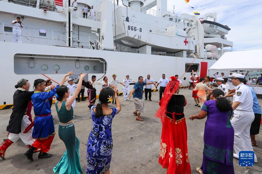 7月15日,中国海军“和平方舟”号医院船抵达基里巴斯塔拉瓦,双方人员在码头欢迎仪式上欢聚一堂。