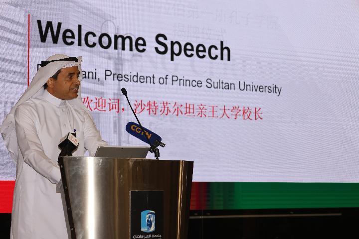 6月4日,在沙特阿拉伯首都利雅得,苏尔坦亲王大学校长艾哈迈德在苏尔坦亲王大学孔子学院揭牌仪式上致辞。新华社记者王海洲摄