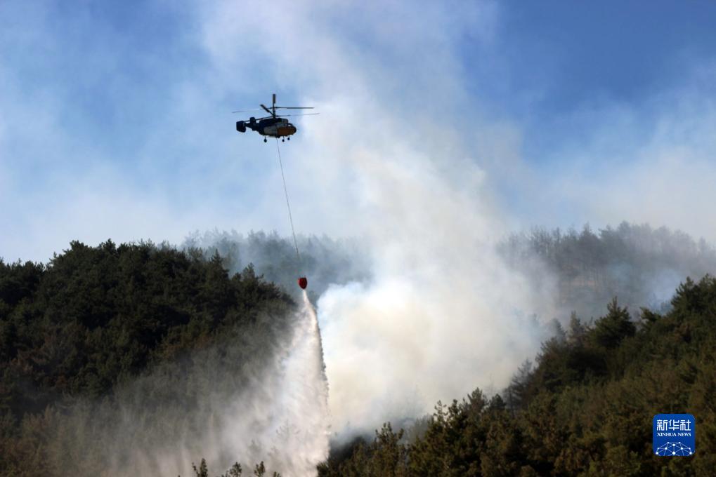7月17日,一架直升机在土耳其哈塔伊省贝伦地区扑灭山火。